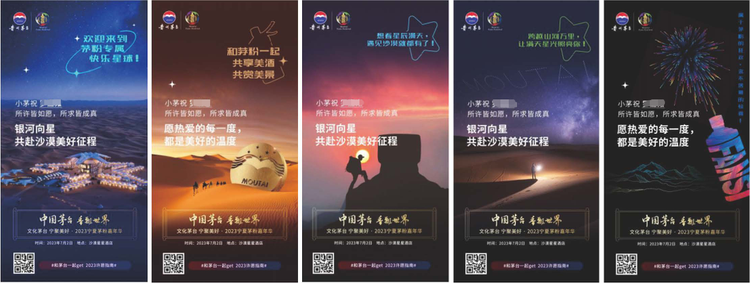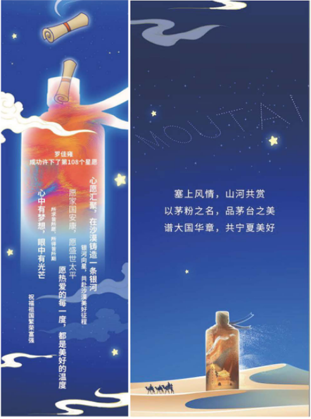 本次寧夏茅粉嘉年華以星空和沙漠為橋梁,深度融合了茅臺文化與寧夏文化,在主KV設(shè)計上選用了藍(lán)天、沙漠、星空為背景,茅臺酒瓶佇立在畫面中間,酒瓶中是寧夏地標(biāo)建筑元素。大漠黃沙,浩瀚星空,充滿了沙漠風(fēng)情,展現(xiàn)了茅臺飄香寧夏大地。
