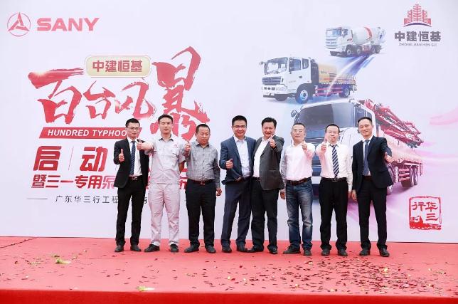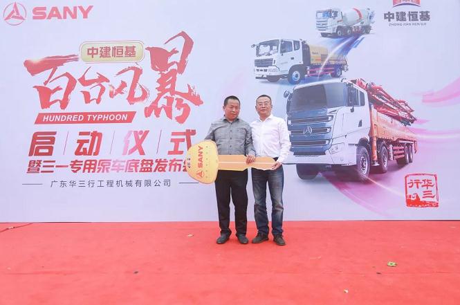4月8日上午10:38,中建恒基“百臺風(fēng)暴”啟動儀式暨三一專用泵車底盤發(fā)布會在廣州南沙隆重舉行