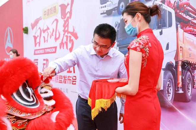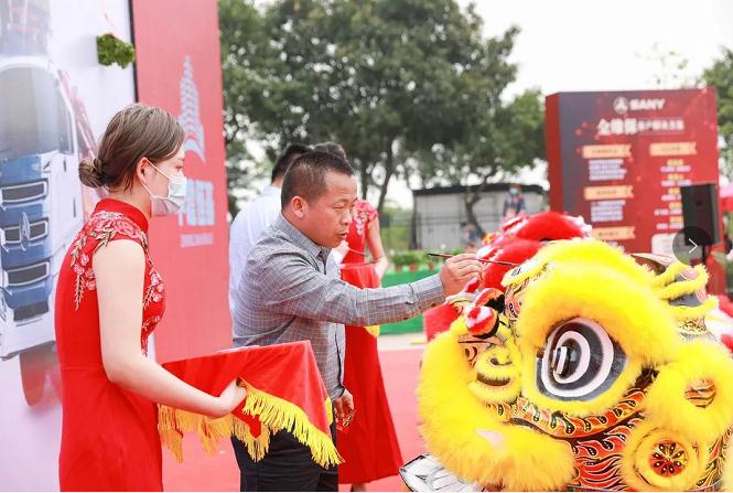產(chǎn)品推介后,三一重工泵送營銷公司總經(jīng)理李梁健、廣東中建恒基執(zhí)行董事王甫上臺進(jìn)行舞獅點睛儀式。
