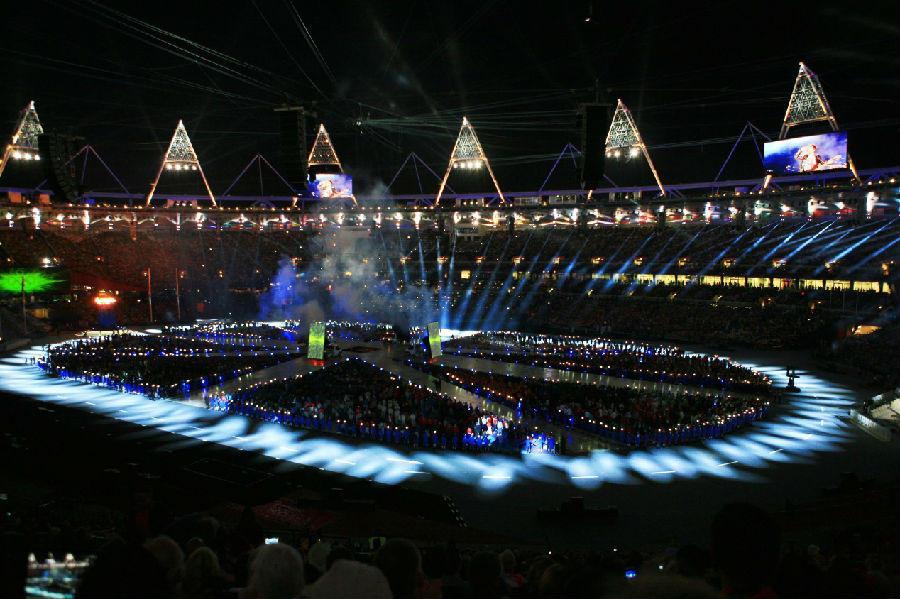 圖6 倫敦奧運(yùn)會(huì)閉幕式現(xiàn)場(chǎng)圖(sharpy燈具的光束從二層觀眾席后區(qū)投射到運(yùn)動(dòng)場(chǎng)跑道上,跨越了約60m的距離)